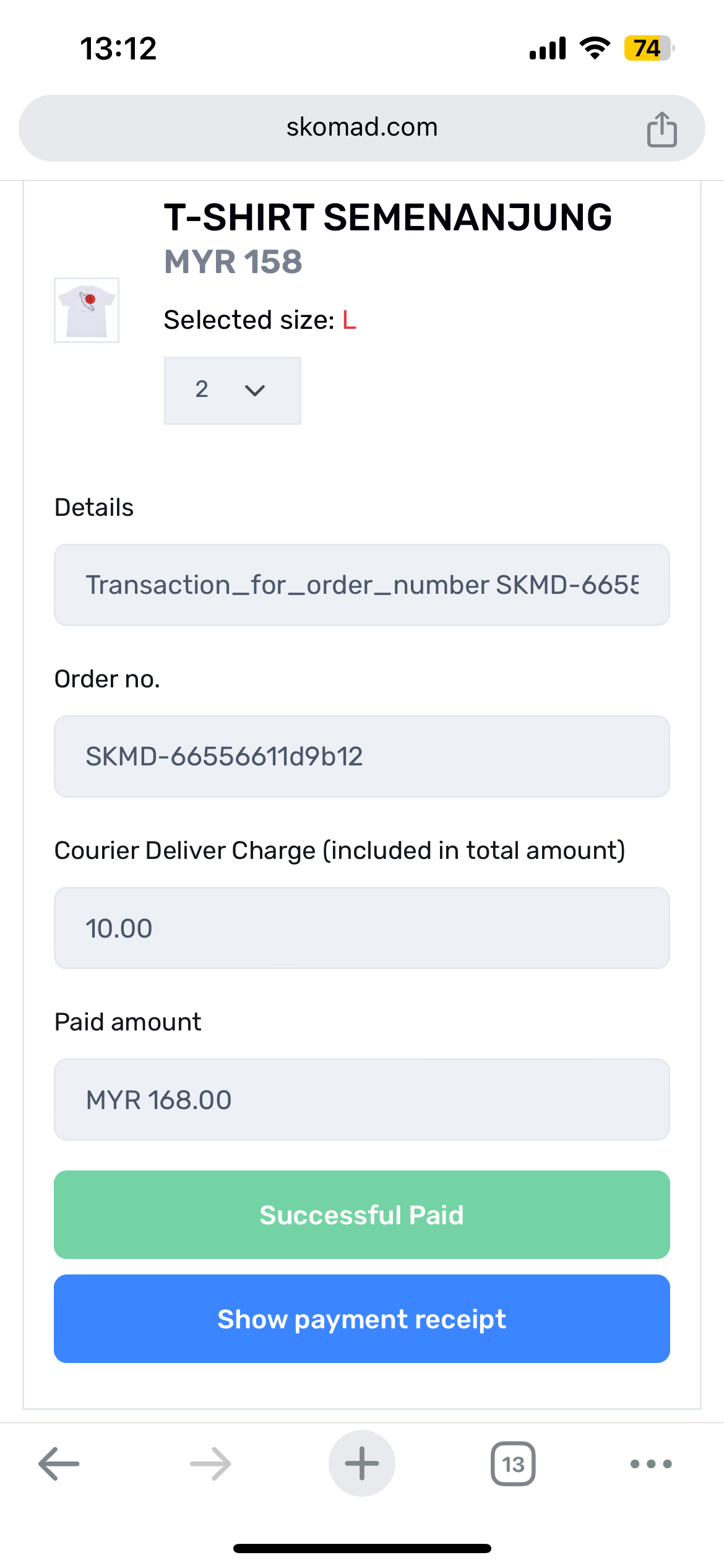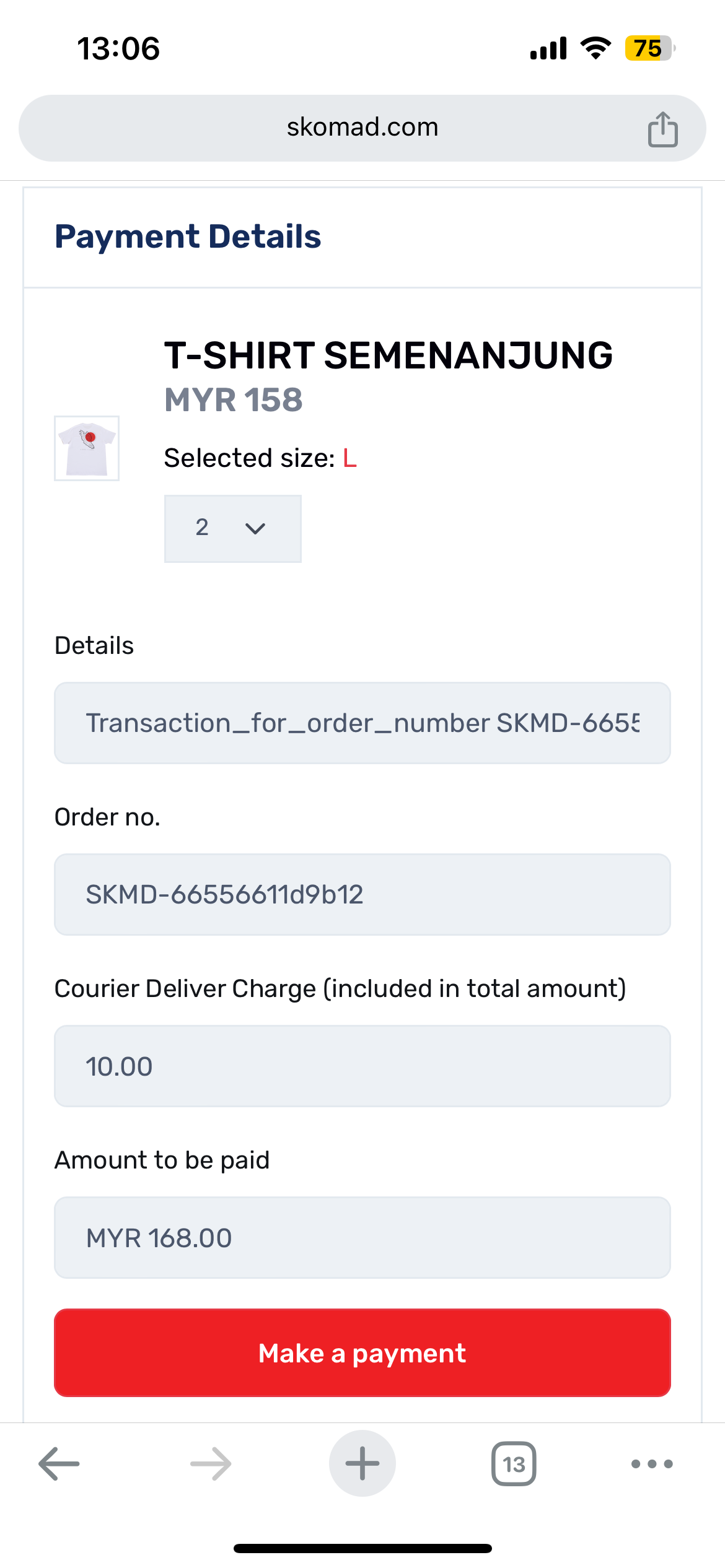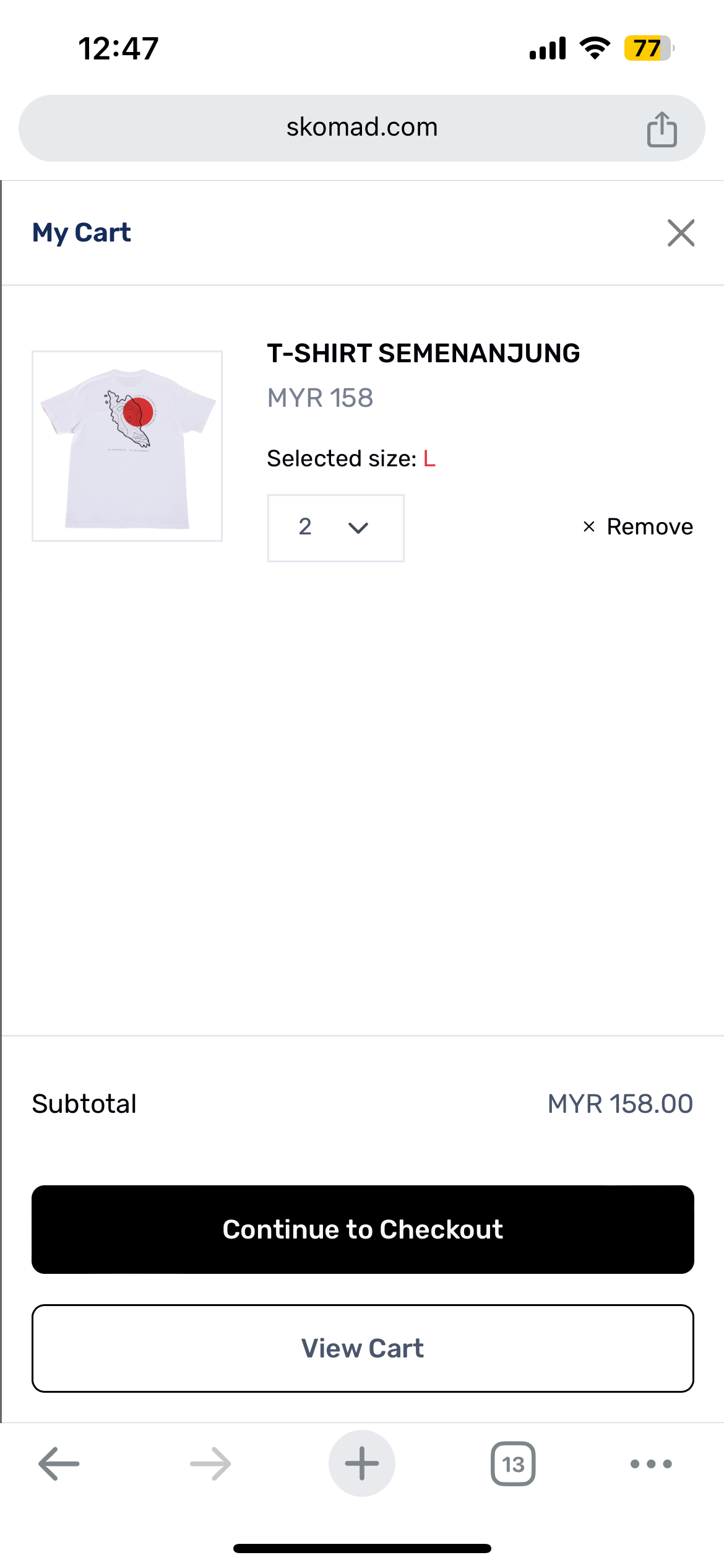 Click to cart's icon below Skomad's logo and this screen will show. Click Continue to Checkout's button to start payment process.