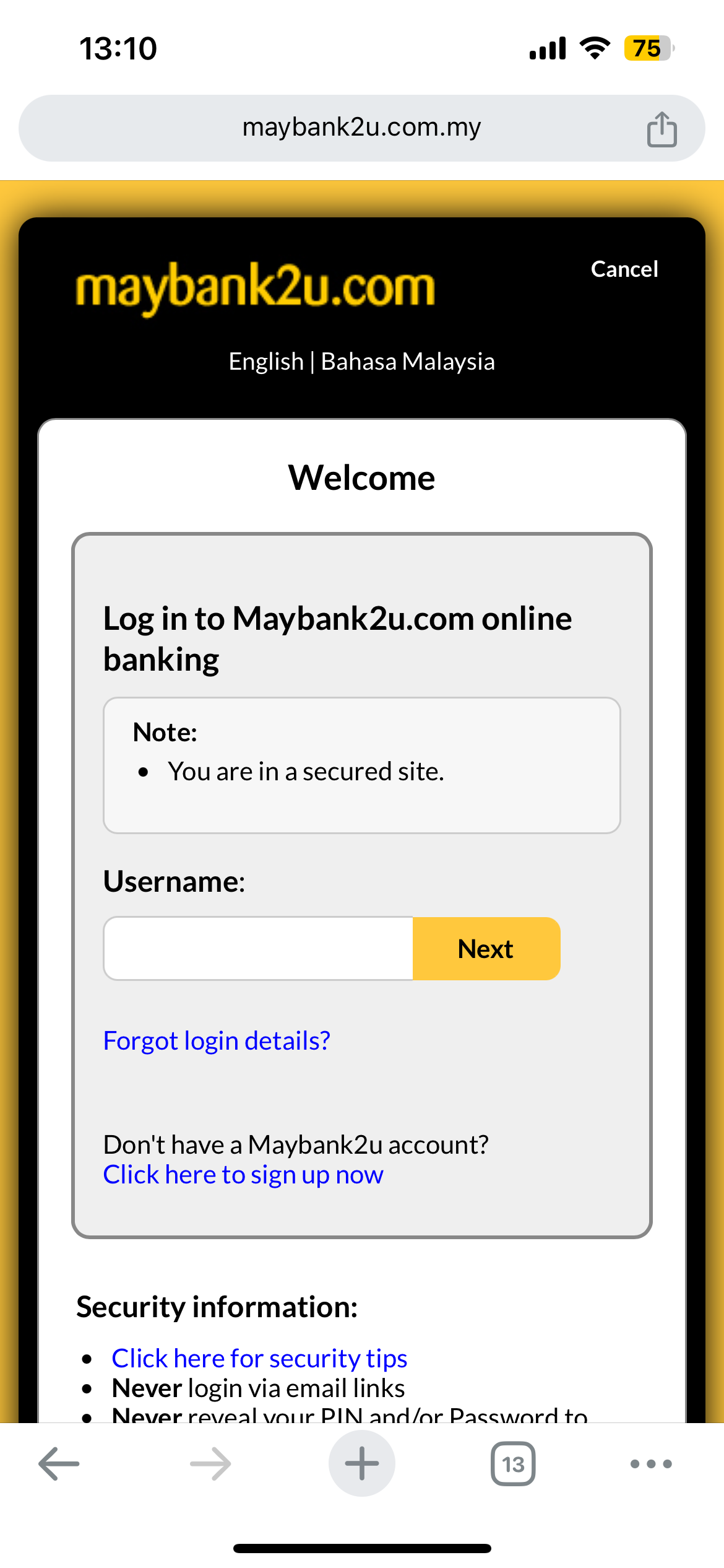 - After select bank, click PAY green button. Screen redirected to login form of the bank selected.